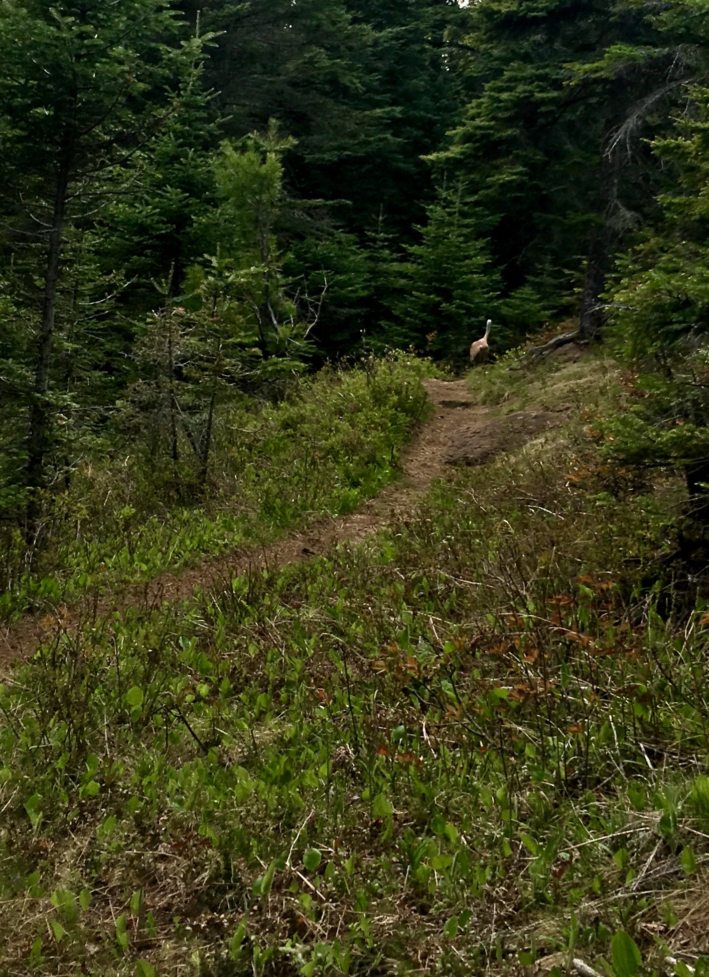 If you’ve read my other trip reports, you know that (i) I always have pratfalls during a trip, and (ii) I like to get these over with early, ideally in the parking lot of the hotel the night before the ferry. The deeper I got into this walk, the more worried I got that my pratfall(s) hadn’t happened yet. Plenty of stumbles but nothing depositing me ignominiously in the dirt. After (I think) the first beaver dam, there’s a hilltop blowdowns clutter like pickup sticks. My feet got tangled in some of these and I crumpled to my knees. I didn’t thereupon topple the rest of the way over, though, leaving open the question of whether this really counted as a pratfall. (FORESHADOWING.)