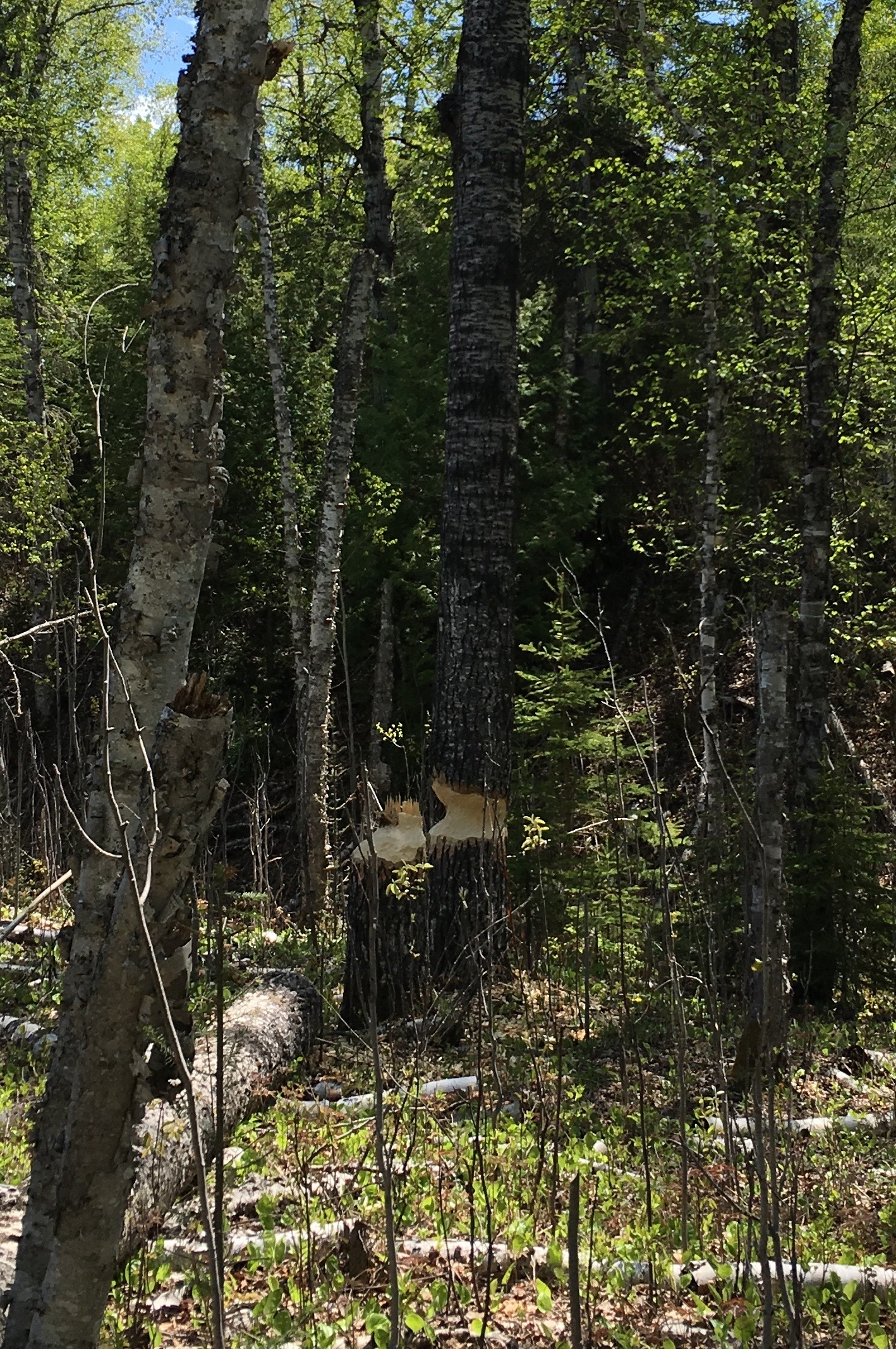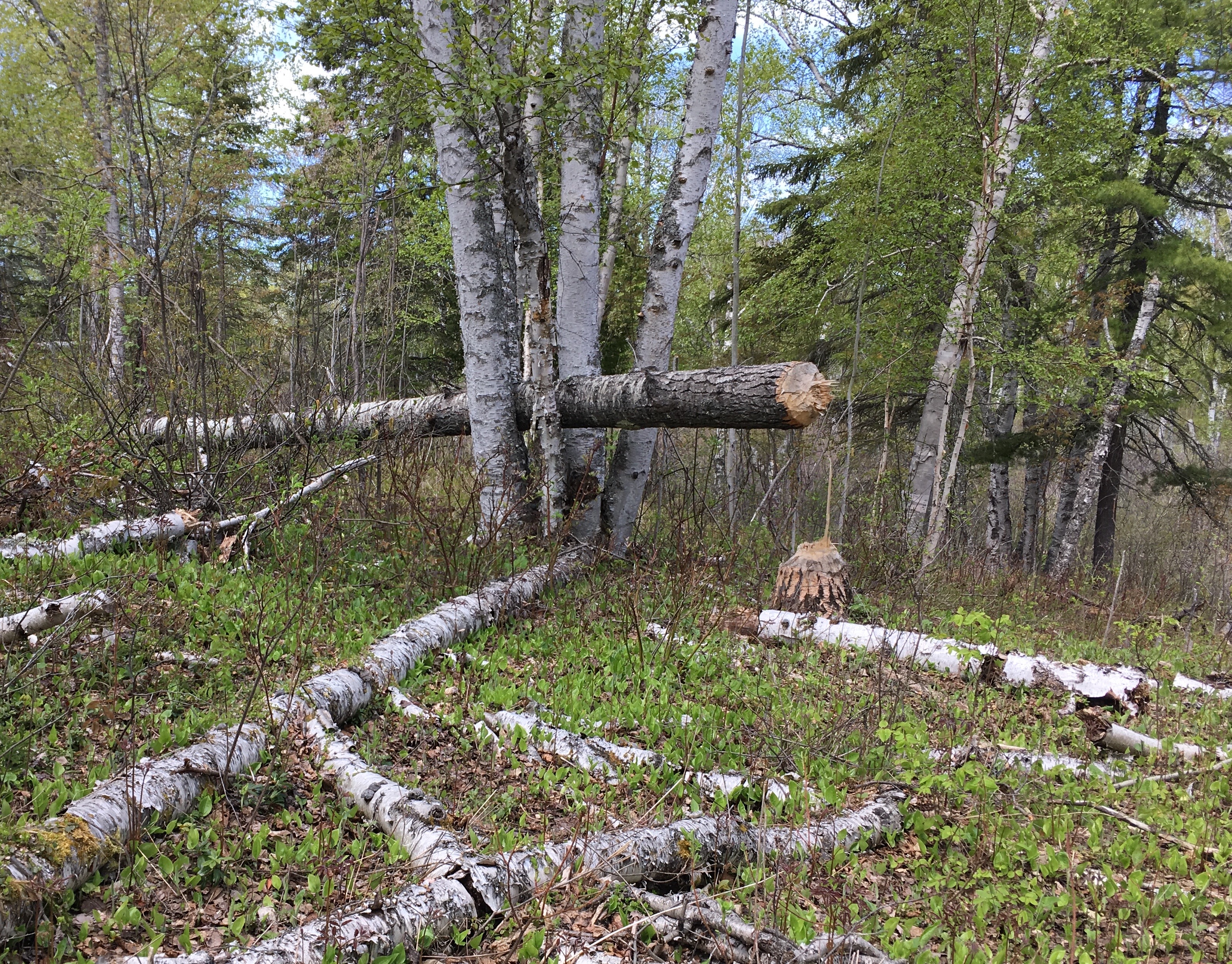 The beavers of East Chickenbone are some arrogant rodents. They’d been working to fell trees hundreds of meters from their lodges, and working as well to fell trees of preposterous girth. Were the wolves of Isle Royale to come to me for advice, I’d counsel them to start hunting East Chickenbone beavers. They seem humongous, maybe even evolutionary throwbacks to the giant beavers who roamed the earth during the Pleistocene. One of them could probably feed a pack for a month. And the ones obsessively gnawing on massive birch trees a quarter mile from shelter should be easy to catch.