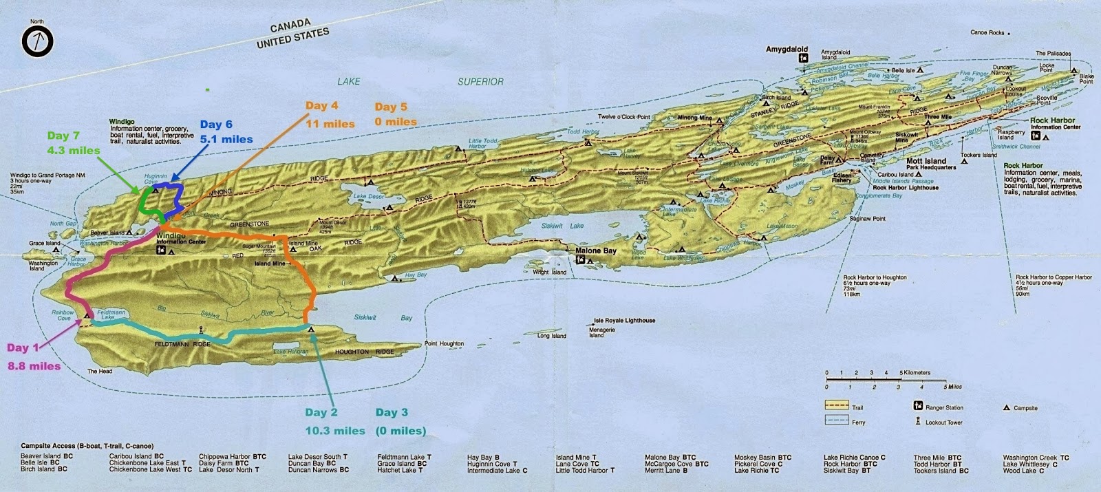 As for the Feldtman loop, I prefer clockwise (Windigo to Island Mine,...). That makes for an easy down hill to Siskiwit. Going the other way, that trail can be a bit of a climb, more so than Windigo to Island Mine. Also, if it is muddy, the uphill climb could be a bit of a mess. I also like this direction because it allows the hike to end on two high notes as opposed to the Island mine to windigo walk in the woods.