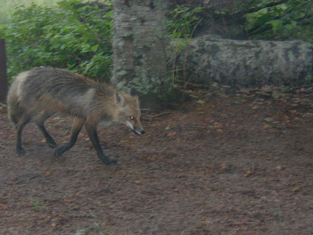 A wet Ransom the Fox walked through our site at dinner time at Daisy Farm in June 2002, our first night on IR