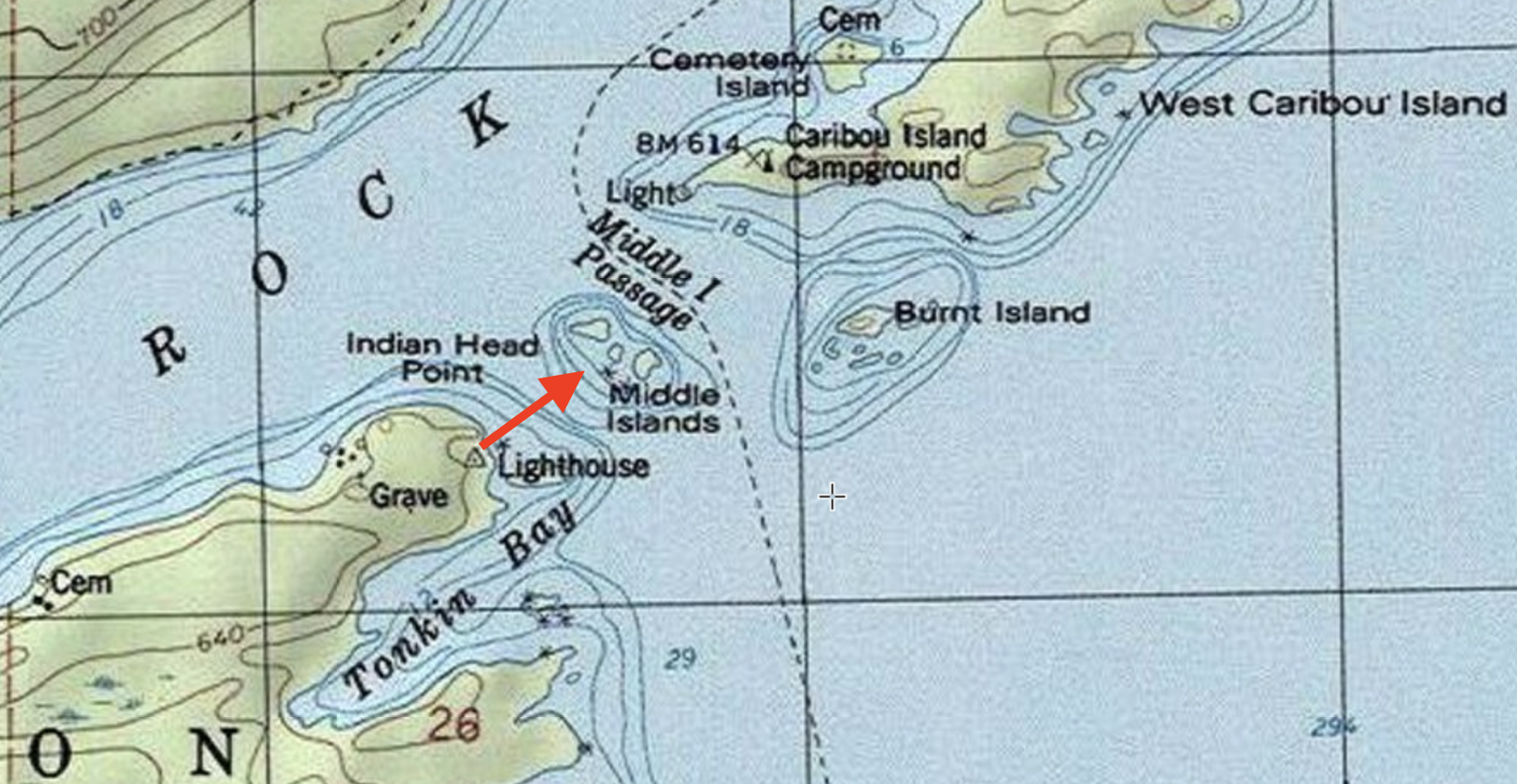 Well done, Bobcat! I can even find those three islets on maps. Apparently they are the actual "Middle Islands" of Middle Island Passage. The land behind them is Caribou Island then.
