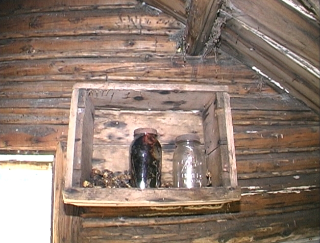 Here are some pictures from the cabin in 2001 before restoration. A lot of the items now inside the cabin were laying around the area and were moved inside. There were and still are chards of pottery in the water and crib remains. My favorite items then were the jars on the shelf. Comparing the pictures, notice the new roof. This probably saved the cabin from falling down.