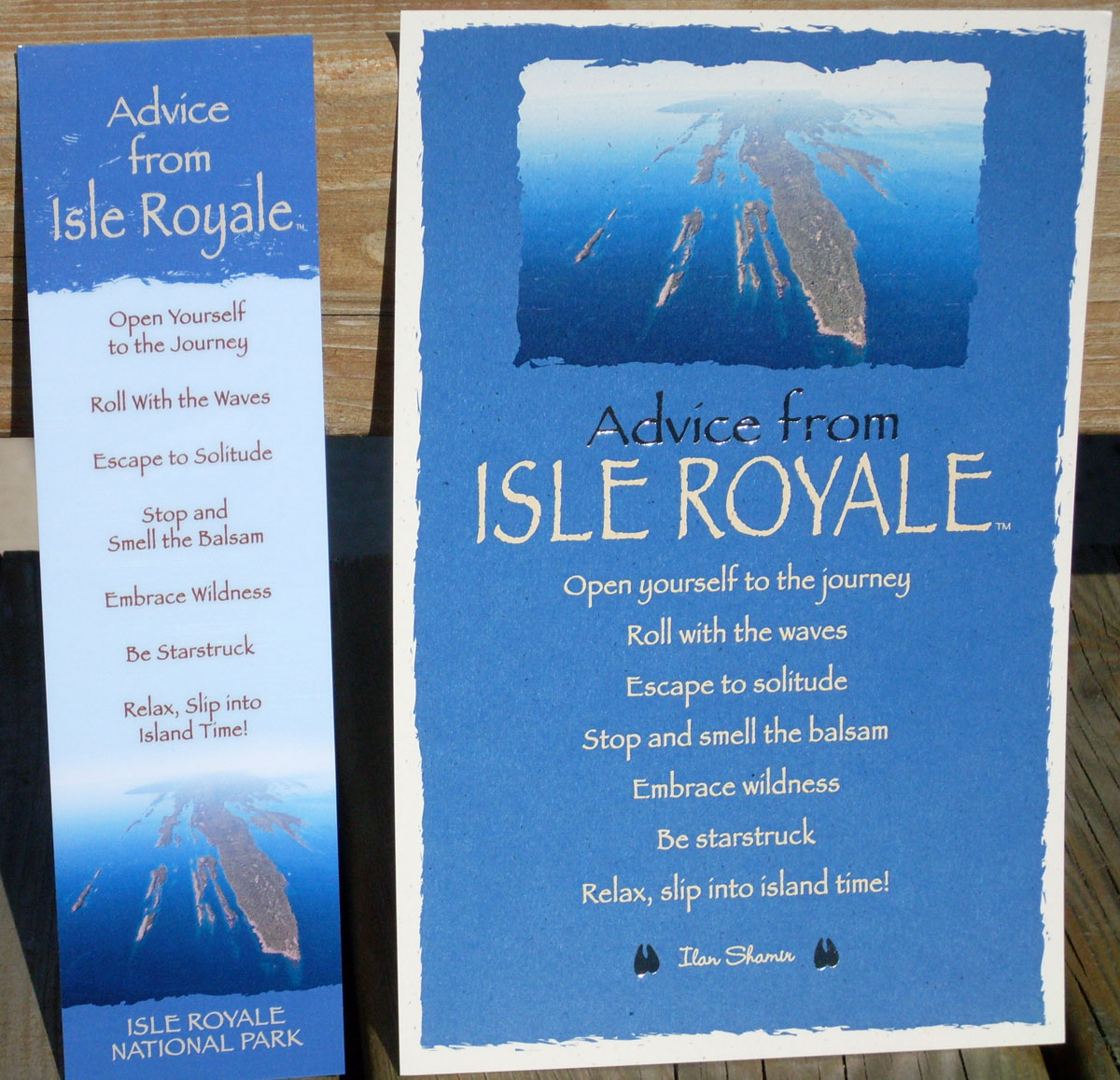 Lauren updates the IRKPA website, but she doesn't have that capability when she's working at Rock Harbor. She didn't have the photo before she headed out there. We also posted new custom Advice from Isle Royale bookmarks and postcards ($2.75 each) on facebook.com/irkpa last week and are waiting for magnets to arrive ($4.50). The new Advice items aren't shopping cart items on our website yet but can be added to orders via the special instructions box or via phone order (800-678-6925). The bandanas, bookmarks, and postcards are also in all three Isle Royale visitor centers (Rock Harbor, Windigo, and Houghton).