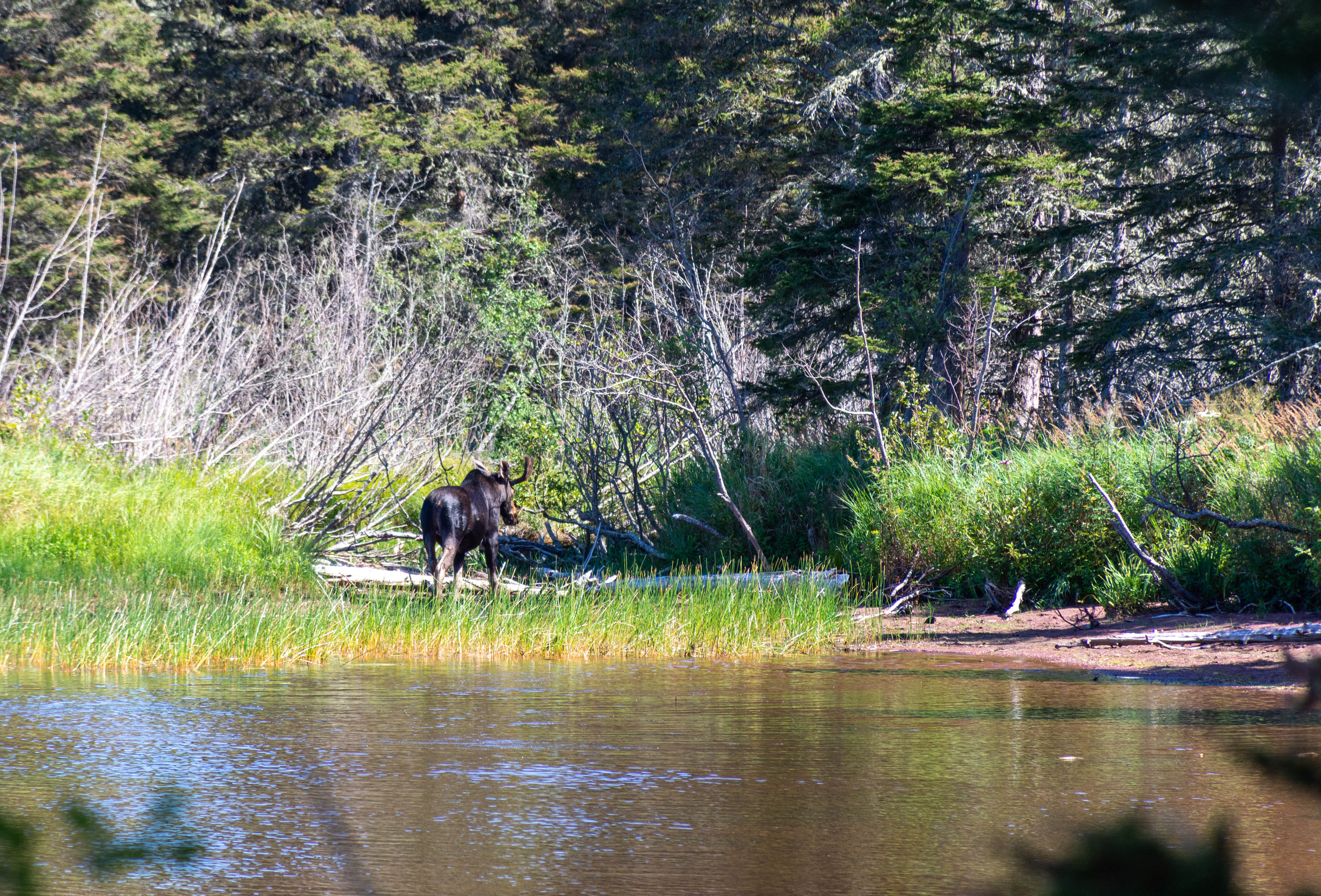 There’s a small pond on the south side of the trail about 2.5-3 miles from Todd Harbor. It looked like a prime moose hangout and, sure enough, we spotted a cow and a calf wading through eating breakfast.