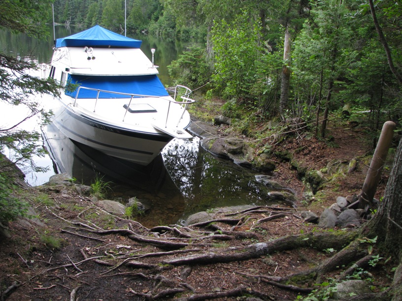 I provided details on this obstruction along with the noise complaint mentioned earlier. The park has the picutures. It was literally one of those times when the picture was worth 1,000 words. This frontal view makes it look like there was more room to maneuver than there actually was. You can't see the underwater rocks that forced you up tight against the boat. My canoe could only go straight in, and couldn't run aground for stability while my body was still over deep water. I couldn't step out without grabbing the deck of the boat to balance myself. I really didn't want to slip and fall right there because I felt higly likely to break an arm or get a head injury.