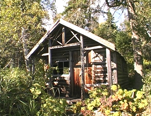 I've been to Chippewa Harbor several times (kayak) and never noticed the cabin. Looking at one of my old slides, I do see it hidden amongst the trees. Look directly behind the little rock island with the seagull, you'll see the roof of a structure back about 20 feet from the shore. I'm guessing this is the cabin.