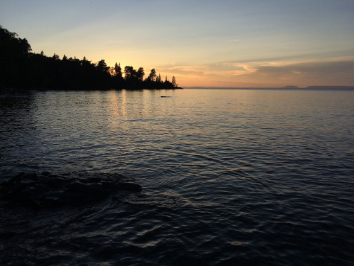 We were rested up and had heard how beautiful Hugginin was. We got packed up and left later as this was a more improved and easier trail than we had been on. We got going but soon it cooled off and rained, and rained.. rained all the way there. Set up on site 2 nearest the sign post. Though we could have easily set them up, we skipped the hammocks and put up the Kelty. Made some hot food and rested and warmed up in our sleeping bags in the tent, talking and playing cards. We saw a group there that we met later back at Washington Creek that had kayaked in, had good success fishing the day before and then kayaked out. Later, another group hiked in and took their remote site. As evening came the skies cleared and gave us a beautiful Lake Superior sunset.