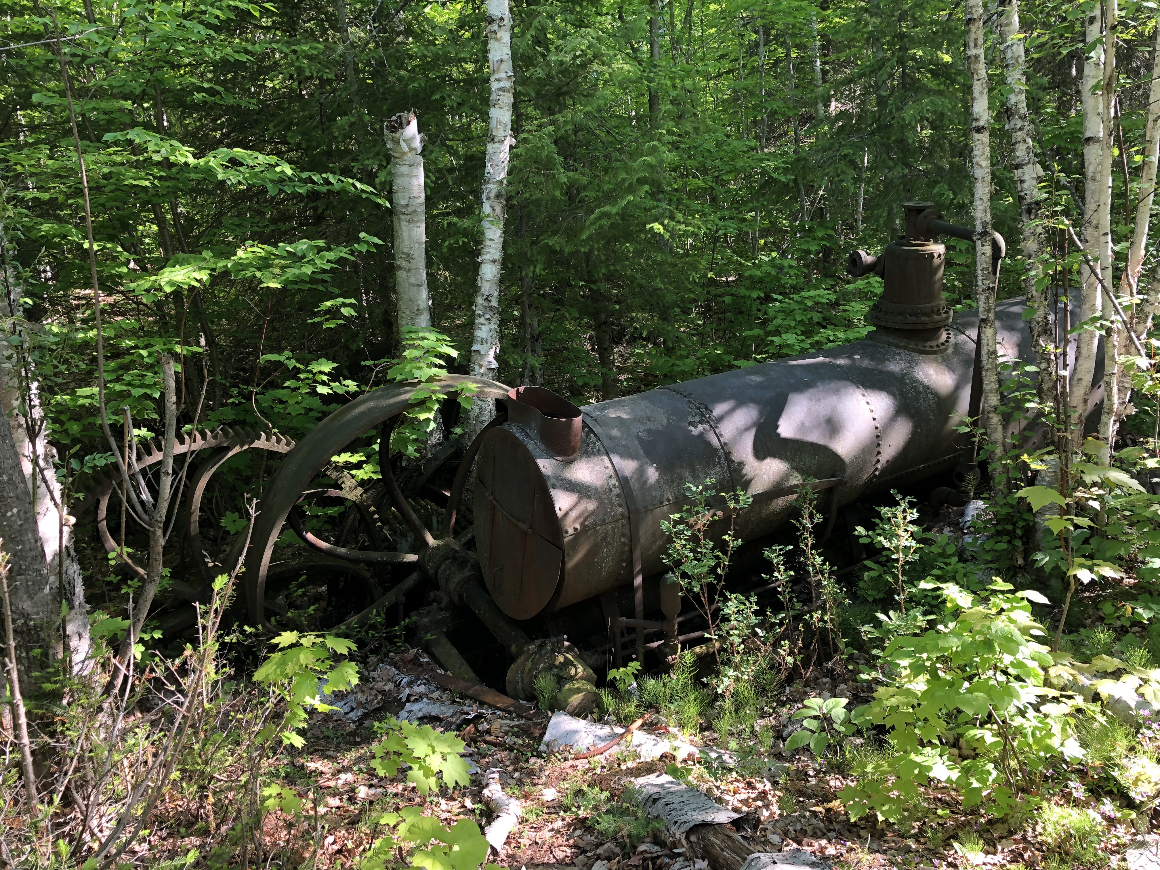 I climbed toward Island Mine eager to see the steam engine, and worried that I wouldn’t recognize the pile of tailings I needed to cross to find it. I shouldn’t have worried: the ruddy, barren tailings couldn’t be more different from their lush woodland surroundings. The steam engine was just on the other side.
