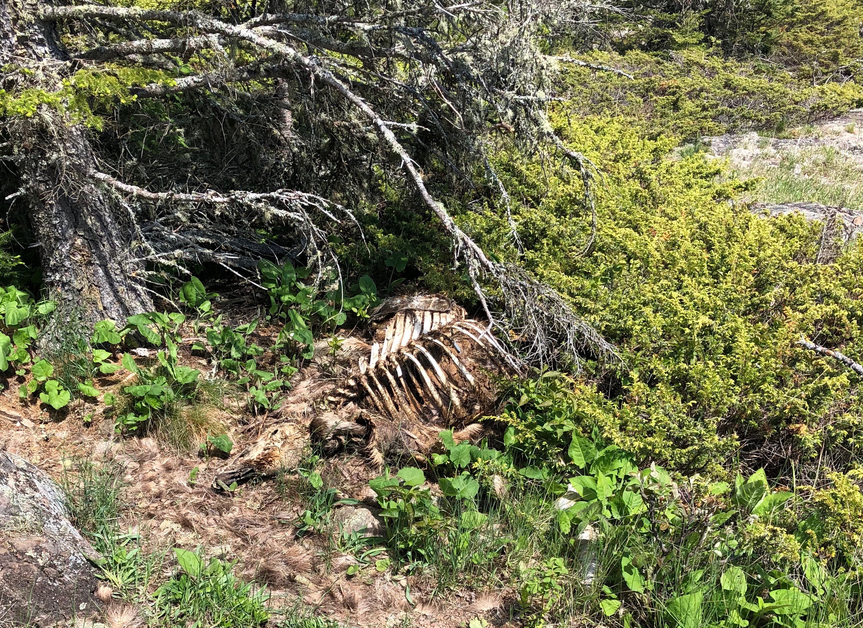 Entering Daisy Farm, right around shelter 10, the trail disappears abruptly under a pond heroic beavers have created by damning Benson creek. Shelter 10’s friendly denizen (who seemed like they might be the only person in camp) explained that I could either skirt the outage by walking the beach, or follow an official detour through DF’s shelter city. I took the beach, rejoined the real trail briefly, then turned left toward Moskey Basin. The Moskey trail was faint but fun, especially for the first spell, when it climbs through and then follows a ridge across a succession of rocky clearings, before starting a woodsy descent. Near the inflection point, smelled before seen, was a former moose, well on his or her way to being a moose skeleton.