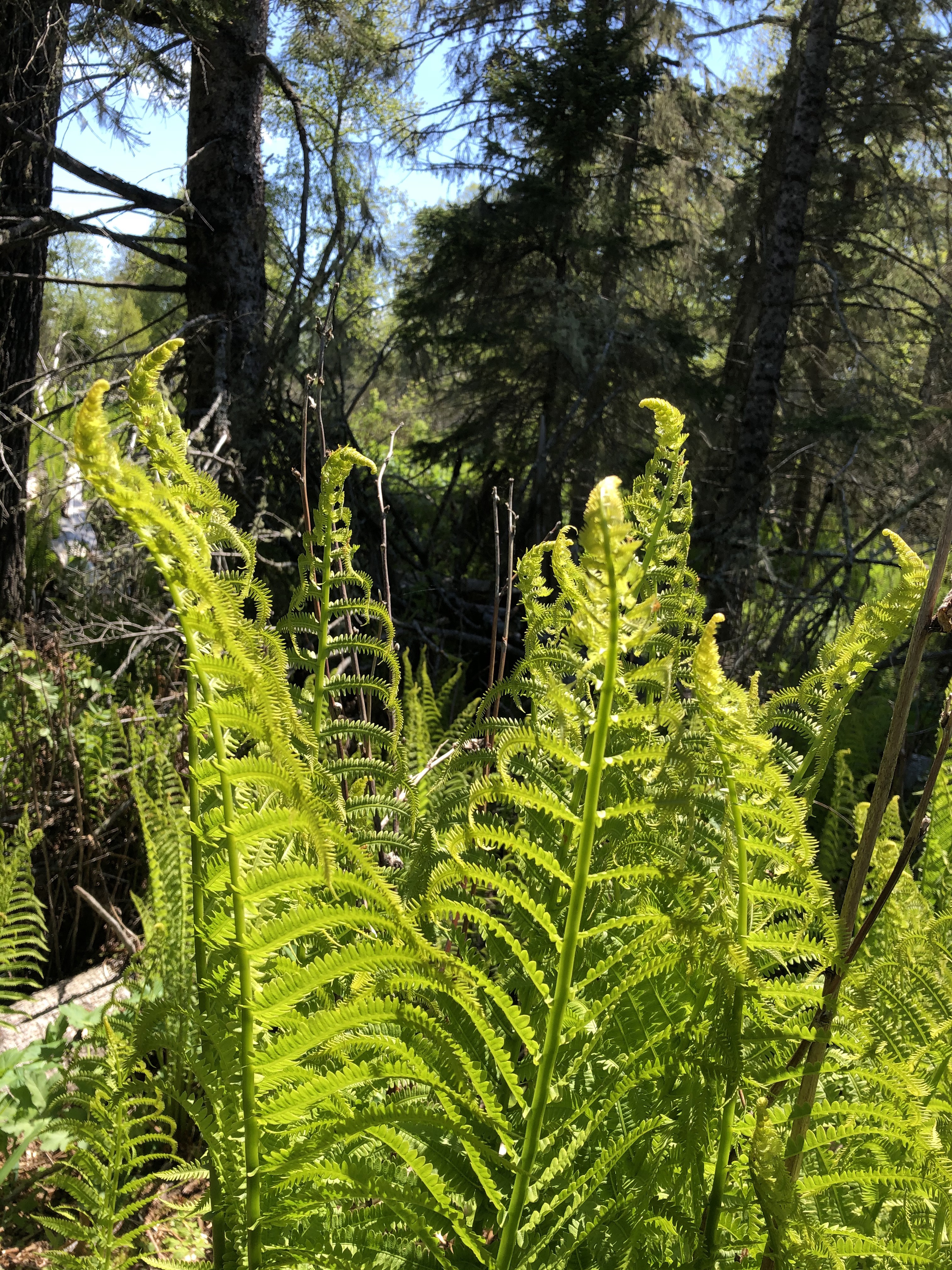 After descending from the overlook ridge, the trail flattens out and crosses a series of pretty interesting swamps and meadows, ornamented by the sorts of ferns I’m more used to seeing in the foreground of pictures of brontosaurus.