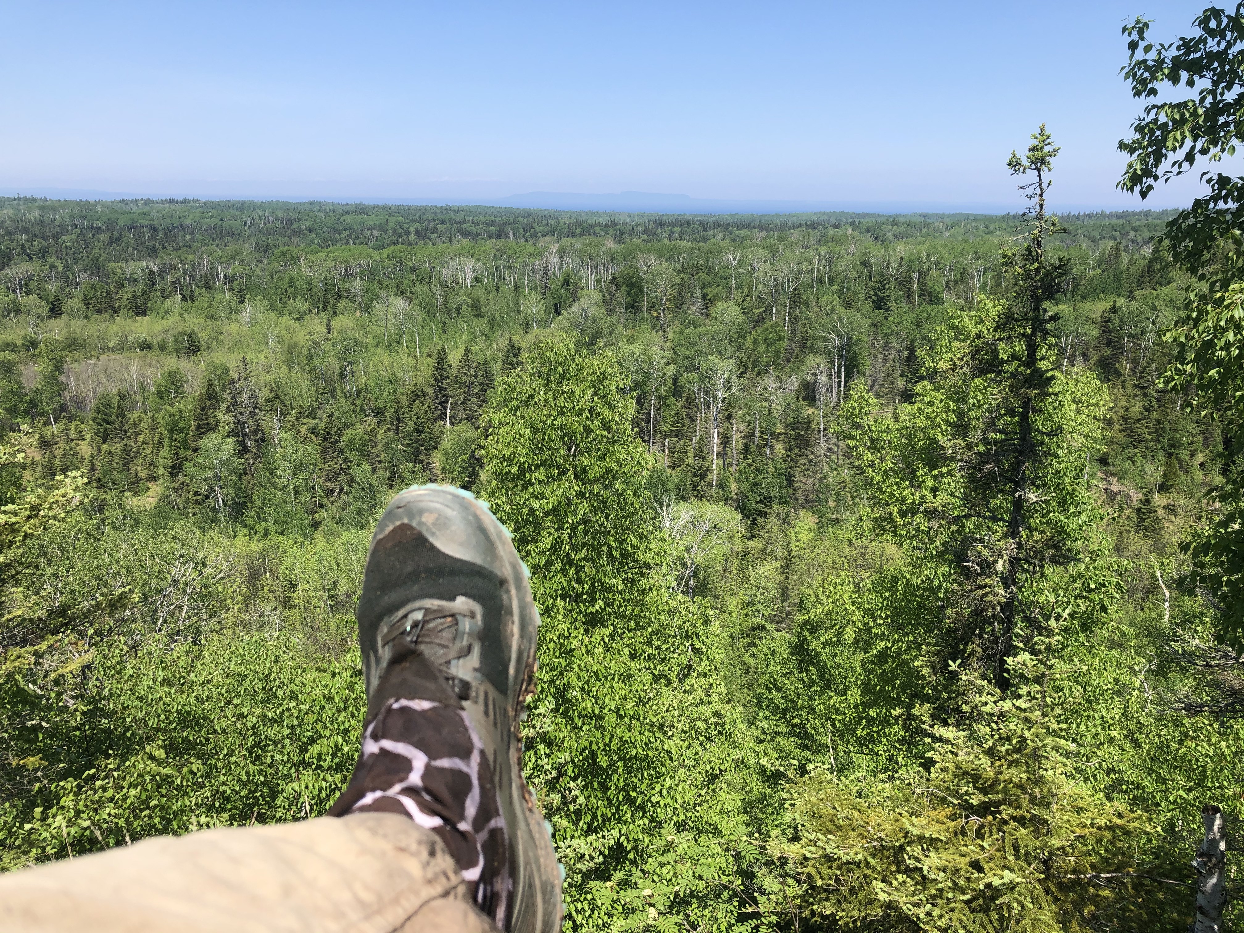 The ridge walk that follows is terrific, with open views of Superior and inland. In a forest-y patch, I came across the moose concierge again. They held up two fingers and pointed into the woods, where a pair of moose were playing it cool. I had an early lunch at the fire tower, which I reached just after the moose concierge, and which you can (and should!) climb most of the way to the top. The sights include a review of the trail to date, and a preview of things to come, with Siskiwit Bay shimmering in the distance.