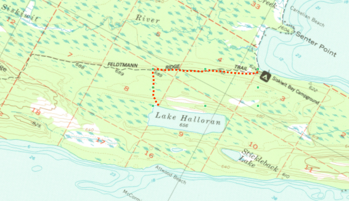 The swamp/beaver pond is to your east as you turn off the Feldtmann Ridge Trail to the South (when you walk west from Siskiwit camp you will see where the swamp stops), make your southward turn just as the pond ends on the trail & follow that general direction back. It has been a few years since I was back there but I'd expect the trip back to be wet. I forget what the azimuth I shot was to go back but its not overly difficult. You can use Acme Mapper to create waypoints if you need something to plug into a GPS. While the hike SSW out of Siskiwit camp to the east end is shorter it's nearly an in-penetrable jungle in some places and I wouldn't suggest it. Once summer vegetation is up along the Feldtmann Ridge Trail it might make the hike back less pleasant then my trip back in May.