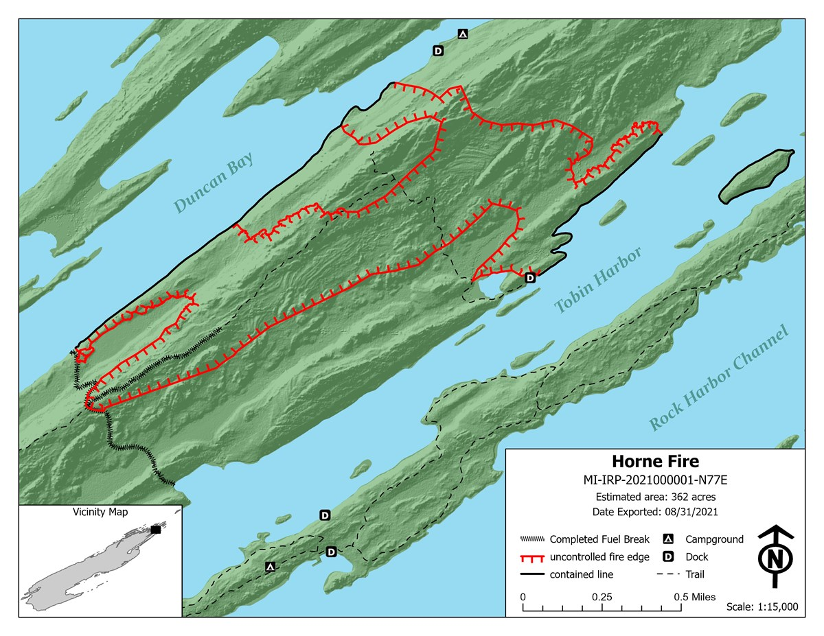 The Horne Fire is approximately 20% contained at this time. Firefighters working to control and contain the fire include 22 from the National Park Service, 8 from the Bureau of Indian Affairs, and 21 firefighters from Virginia. Maps, pictures, and other information from the Horne Fire can be found at: https://www.nps.gov/isro/wildfires-at-isle-royale.htm