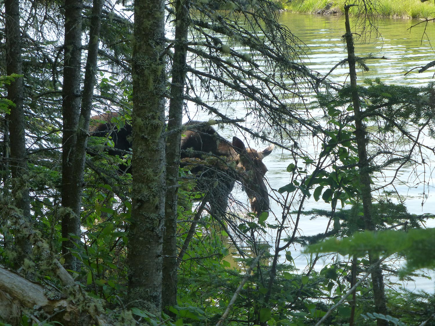 It rained intermittently after I reached camp, but cleared up for another amazing sunset. I was in my tent writing in my journal when I was startled by a loud noise that turned out to be a bull moose pulling vegetation out of the ground not far from my site. I watched him for a while, in the trees just behind the campsites by the latrine. He eventually wandered off.